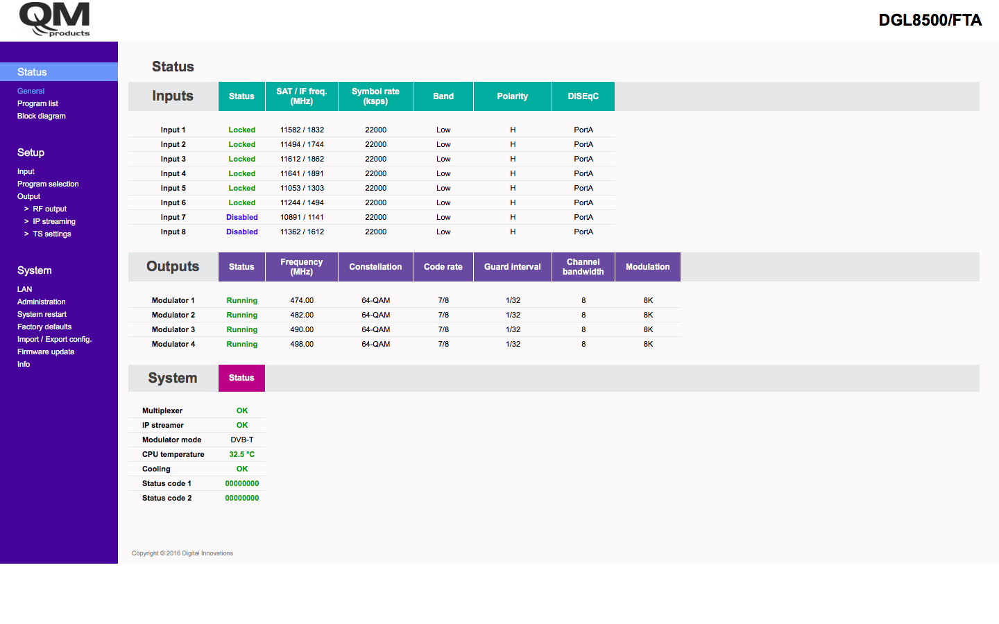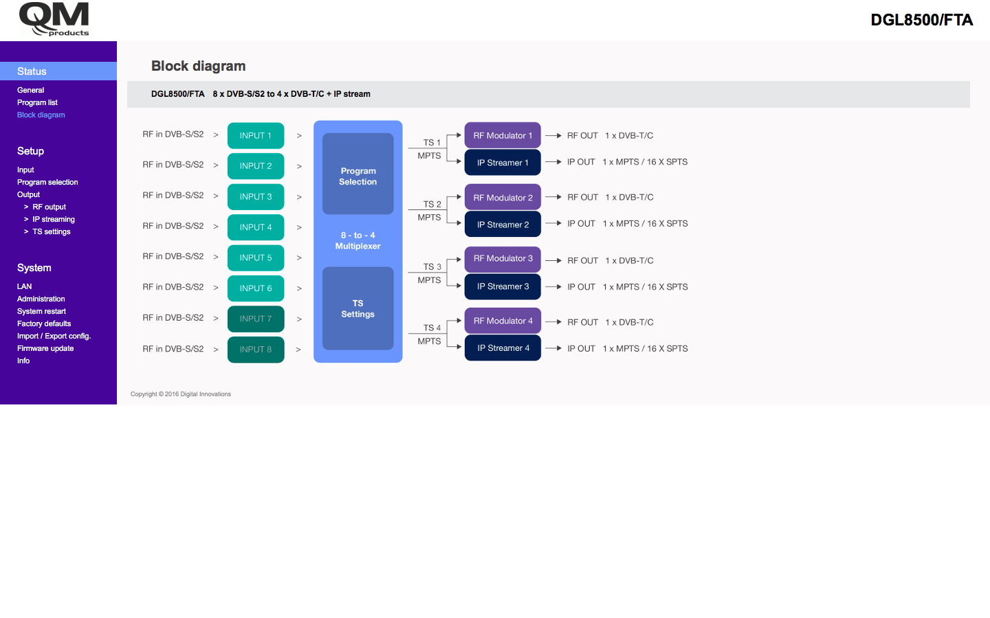- 8x egymástól függetlenűl programozható DVB-S2 (műholdas) bemenet egyszerre nyolc különböző jelforrás jeleit képes fogadni