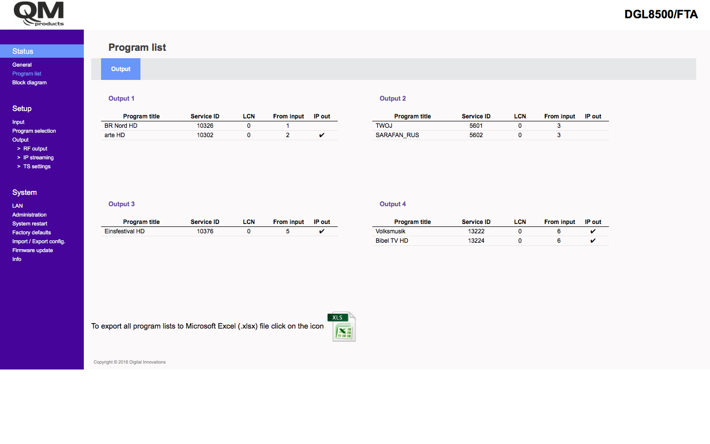 - 4x RF modulátor kimenet, (DVB-T vagy DVB-C) szoftverből állítható így gyakorlatilag bármilyen koax hálózaton továbbítható és tetszőlegesen osztható a kimeneti jele