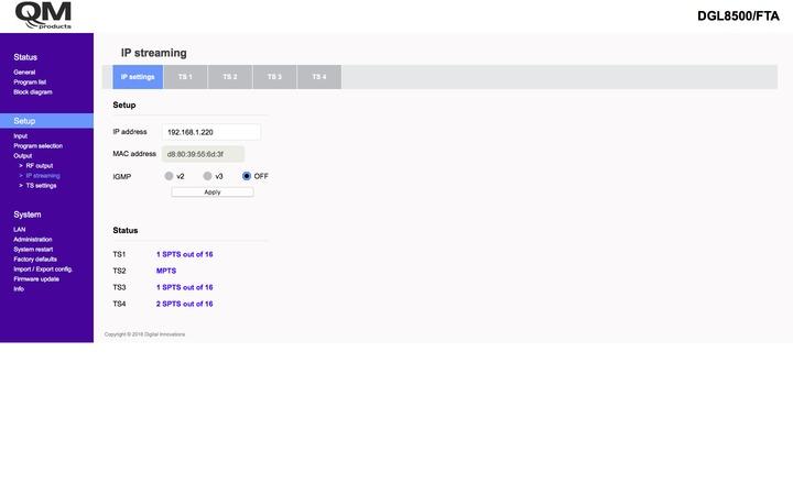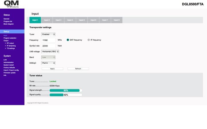 Az Aartech DGL-8500 típusú eszköz 8x DVB-S2 bemenet lehetővé teszi, hogy akár 8 egymástól független műholdas jelet továbbítson DVB-T vagy DVB-C és IP -n keresztül. A 4x RF kimenet további kényelmet és szabadságot tesz lehetővé, ugyanis ez biztosítja, hogy akár 4 különböző frekvencián streamelje a tartalmat. Panziók, szállodák, éttermek, kollégiumok illetve egyéb jól frekventált közösségi helyeken lehet a legjobban használni.