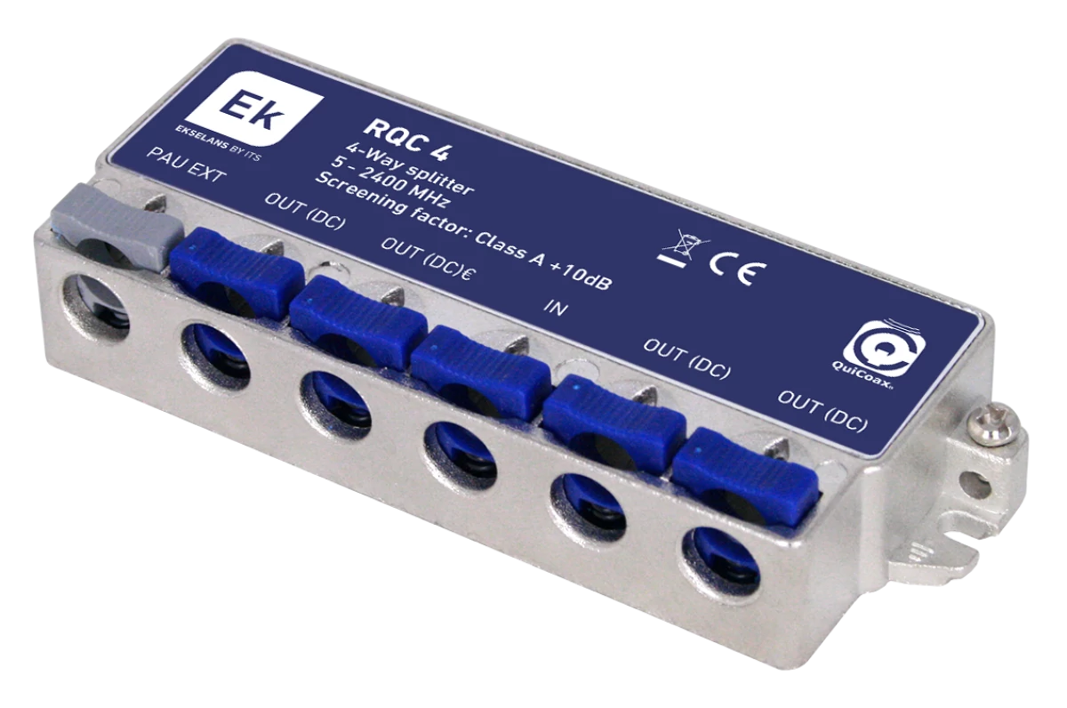 Egy remek 4 kimenettel rendelkező RF osztó ami tökéletes választás műholdas (DVB-S), kábeltévés (DVB-C) és digitális földfelszíni (DVB-T/T2) vagyis Mindig TV jel osztására. Az egyik legjobb tulajdonsága ennek a típusú osztónak, hogy nem kell F csatlakozót szerelni a koax kábelre, elegendő csupán megblankolni a koax kábelt.